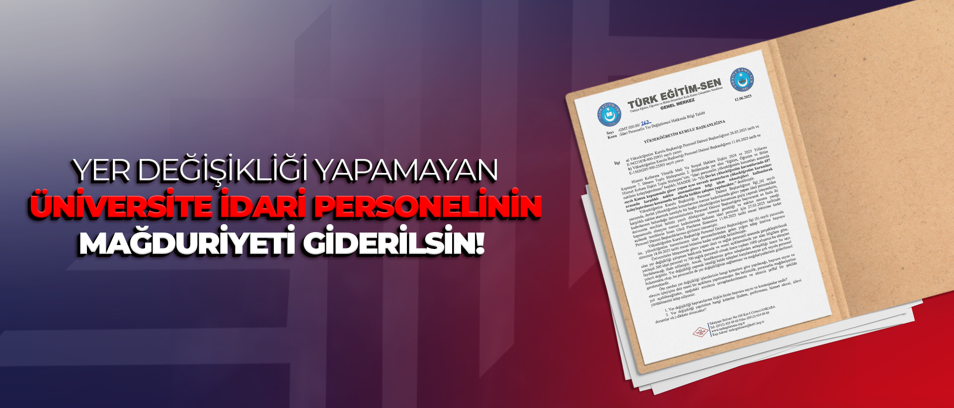 Türk Eğitim Sen olarak izah edilen nedenlerle, konunun ivedilikle ele alınarak, personelin haklarının korunması adına gerekli açıklamaların yapılması ve sürecin adil bir şekilde yürütülmesi, yer değişikliği yapamayan personelin mağduriyetinin giderilmesi, yukarıda yer alan sorularla ilgili bilgi edinme hakkı çerçevesinde sendikamıza bilgi verilmesi hususunda YÖK’e yazılı talepte bulunduk.